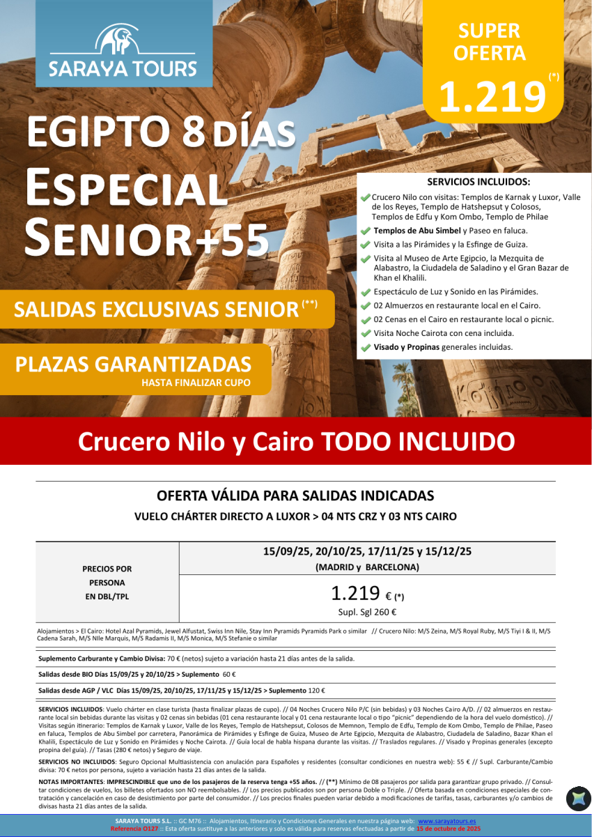 Especial Egipto Senior 8 días *Salidas Mad,Bcn,Bio, Agp & Vlc* Crucero y Cairo con visitas y mas! Hasta Sept26